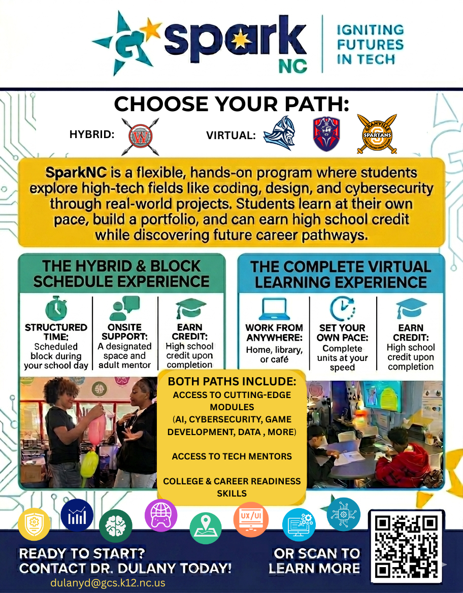 April 17, 2026 Learn more about SparkNC 💻✨ Explore your future in tech with SparkNC! This flexible, hands-on program lets students dive into coding, design, cybersecurity, and more—while earning high school credit. Learn more! For more i...