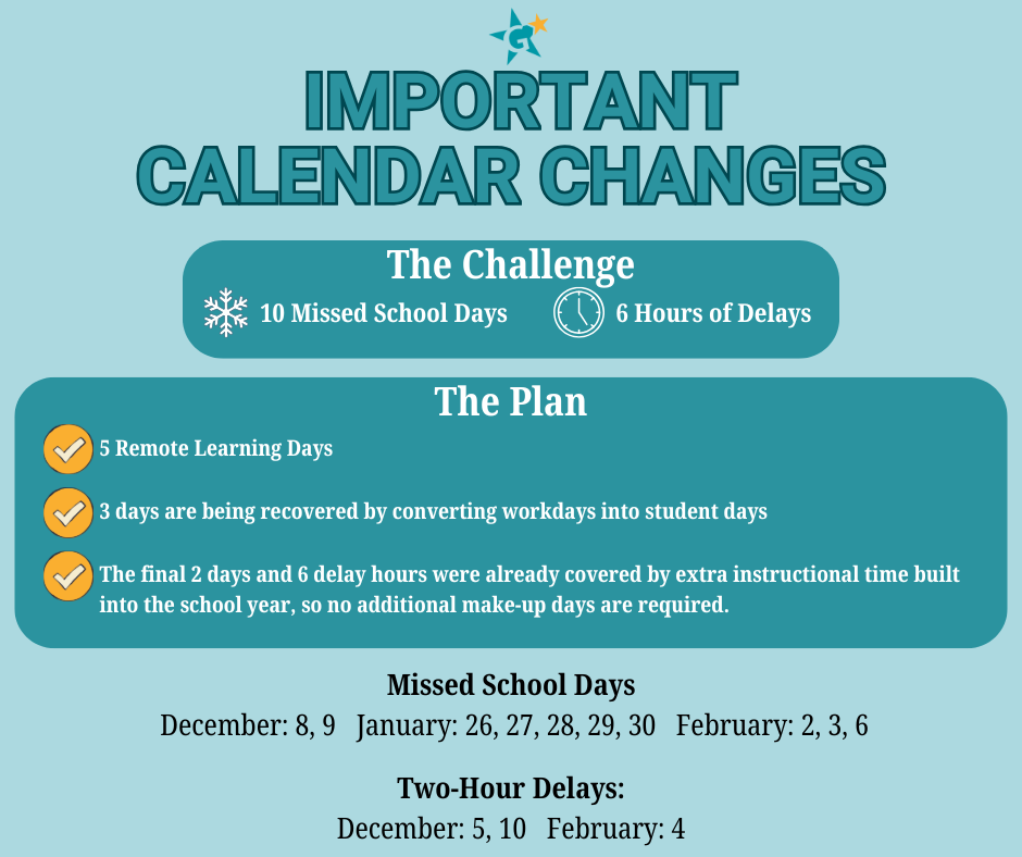 Due to missed instructional time from winter weather, adjustments have been made to our school calendar. Five days of remote learning have been completed, three workdays are now student days, and the remaining time was already built into the school year—so no additional make-up days are needed.